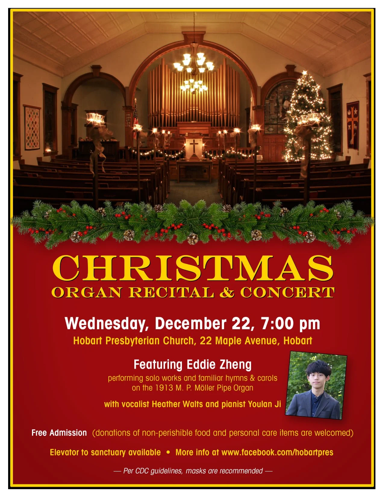 The Hobart Presbyterian Church will be presenting a musical event featuring familiar Christmas hymns and carols and a talented young organist on December 22 at 7:00 pm in the church sanctuary.